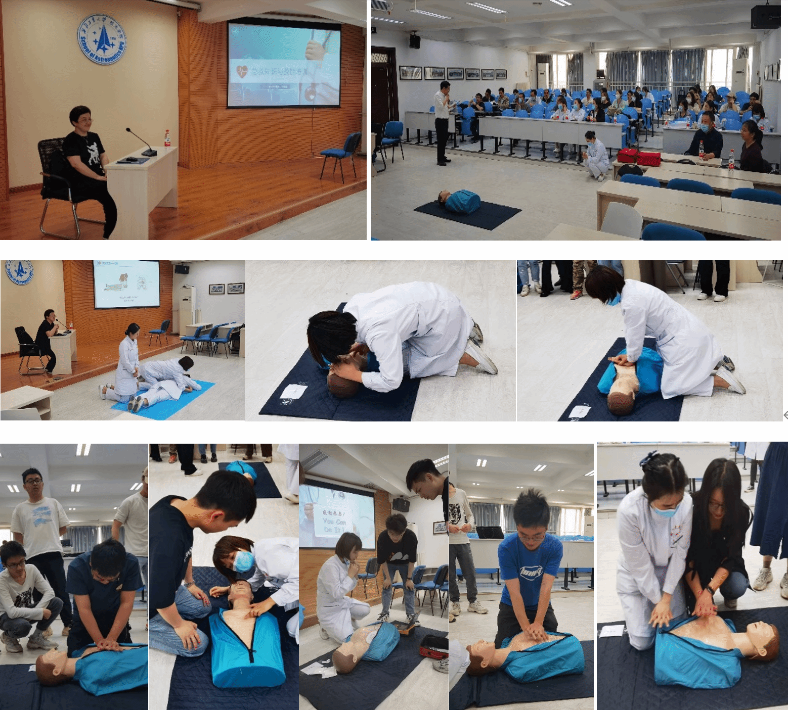 师生做了《急救知识与技能培训》报告,详细讲解了心肺复苏基本理论知识及实践操作要点、自动体外除颤器( AED) 的使用和海姆立克急救法。讲解过程中,校医院工作人员现场演示心肺复苏,AED 实践操作方法,使大家深入了解心肺复苏相关救护知识。同时,为了更加细致解答师生在急救操作过程中存在的问题,校医院汤燕医生、刘瑁医生、袁华护士、马沛瑶护士、王丽护士和董豪护士等手把手指导现场师生练习急救操作。通过本次培训,学院师生基本掌握了心跳呼吸骤停及气道异物梗阻的急救方法,提升了应急处置能力,取得了非常好的效果。