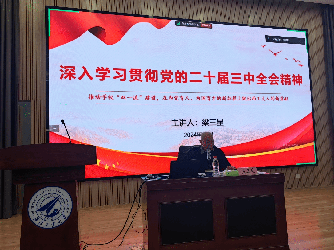 11月13日,学校关工委“五老”宣讲团银发宣讲员梁三星教授讲授《深入学习贯彻党的二十届三中全会精神,推动学校‘双一流’建设》专题党课。梁教授从党的二十届三中全会公报主要内容、党的二十届三中全会《决定》的主要内容、贯彻全会精神推动西工大“双一流”建设三个部分为大家进行了深度讲解。希望大家深入学习党的二十届三中全会精神,为推动学校“双一流”建设贡献力量。