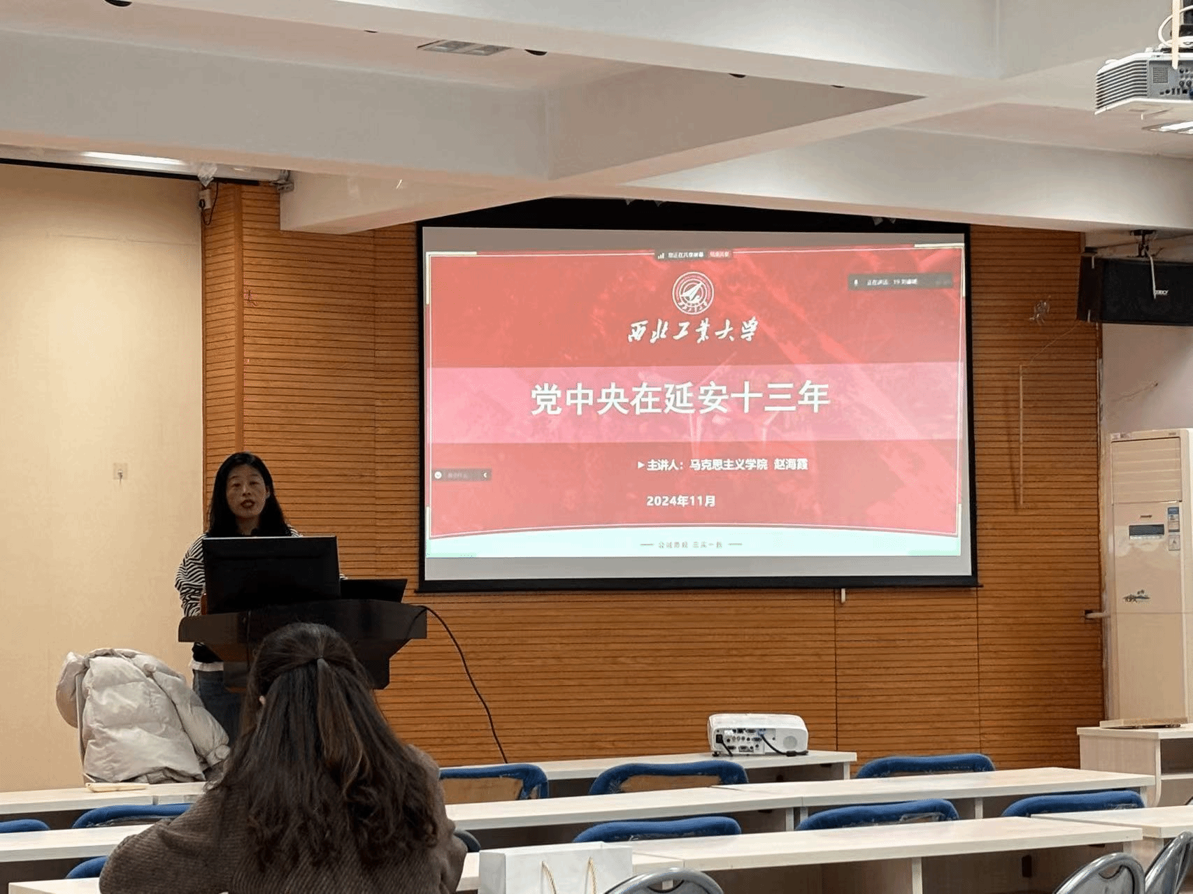 11月16日,邀请马克思主义学院赵海霞副教授讲授《党中央在延安十三年》专题党课。赵老师满怀着对革命先辈的崇敬之情,将时光拉回1935 年至 1948 年那段党中央扎根延安的难忘十三年。从中央红军历经艰难长征,落脚吴起镇,到延安成为中国革命“落脚点“与 ”出发点“,一幅宏大且艰辛的历史画卷徐徐展开。赵老师带领学员们共同穿越历史时空,回溯那段波澜壮阔、铸就辉煌的峥嵘岁月,赓续红色血脉,汲取前行的智慧与力量。