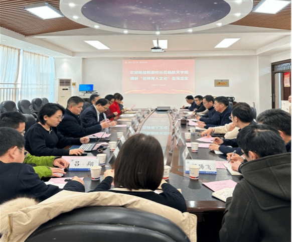 黄攀峰代表学院对杨校长一行来院调研指导表示热烈欢迎,对学校教务部长期以来对学院人才培养的关心关怀表示衷心感谢,希望通过此次调研活动,进一步促进学院“总师育人文化”持续走深走实,引领学院的航天“总师型”人才培养。孟中杰从文化传承、走深走实思路,具体举措、下一步工作计划四个方面对学院“总师育人文化”走实走深情况进行汇报,重点围绕七种素质和能力培养,从建设思政育人新模式、铸牢扎实育人基础、开拓宽广育人视野、探索创新育人方案、打造人文育人特色五个方面汇报了学院的特色做法。