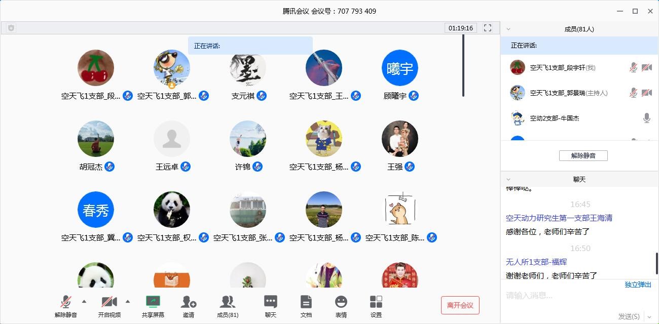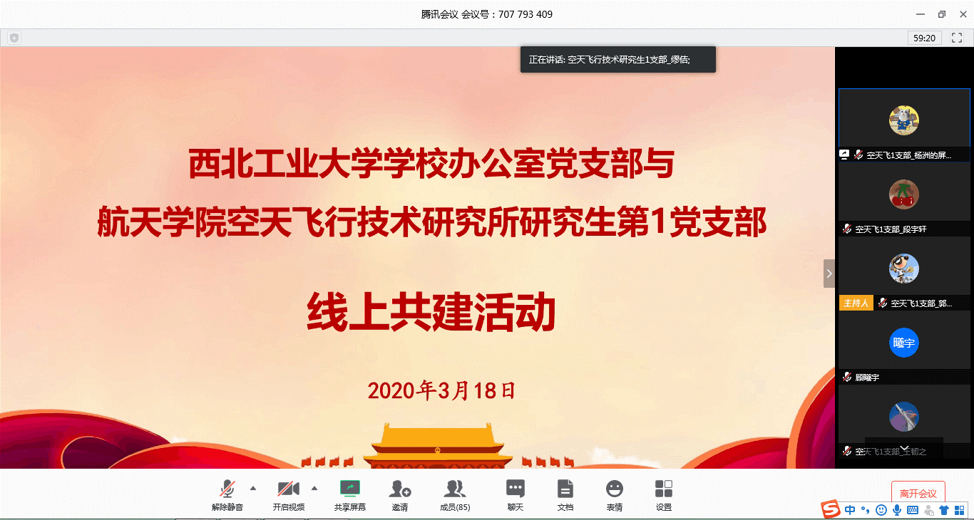 随后学生党员代表廖家震、高逸夫、缪佶、张睿轩、张云伟、马振宇分别发言,交流他们的体会。他们有人介绍了湖北地区的生活防疫现状,有人讲述了“90后”能担当大任的感想,有人讲述了线上毕业答辩与线上学堂的经历体会,有人就自己承担本科生课程助教与班级小导师的工作经历与感受进行了交流。他们热情阳光、慷锵有力的论调,彰显着西工大学子们抗疫必胜的决心。