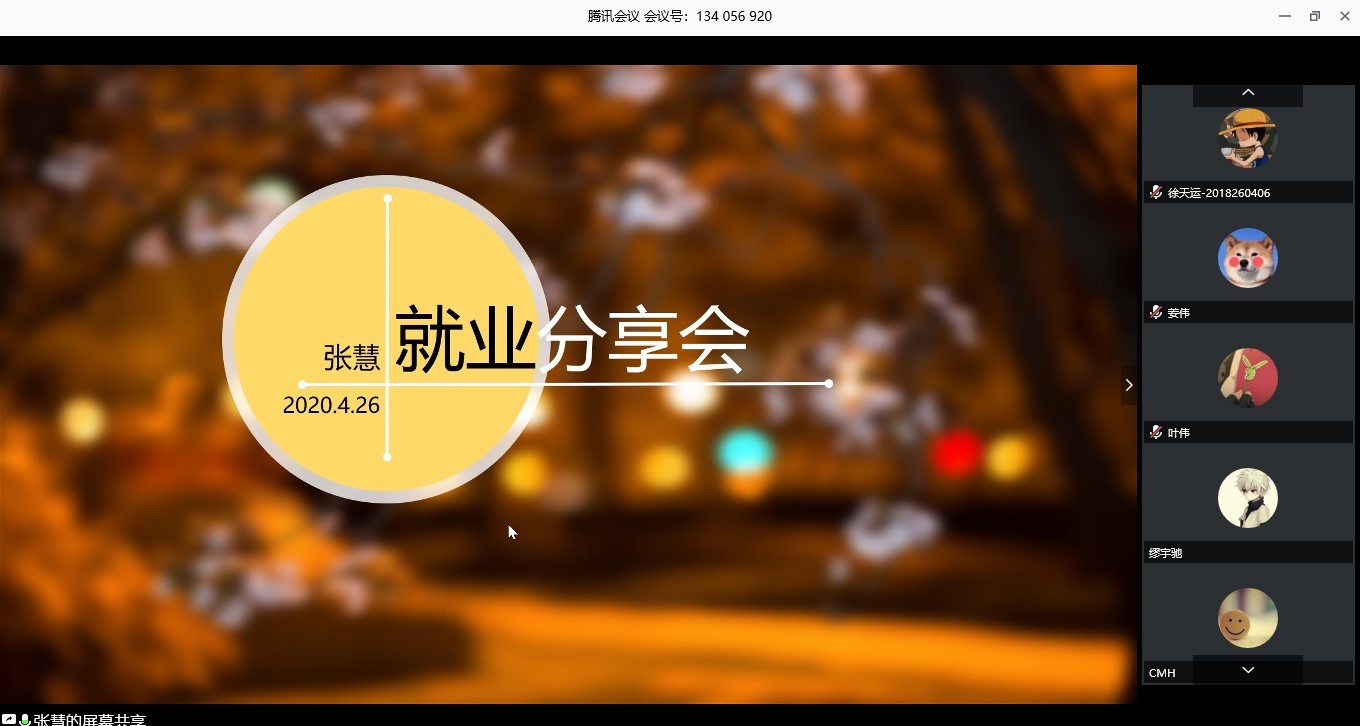 2020年4月26日上午,精确制导与控制研究所“薪火相传”升学就业分享会在腾讯会议举行。本次活动由精导所研究生第一党支部和第二党支部策划主办、18202-5团支部和19202-5团支部协办,旨在为在读研究生提供一个相互学习、交流的机会,帮助大家对就业升学有更清晰的认识。本次活动邀请了四位2020届硕士毕业生代表分享他们升学就业的经历,分别是走向工作岗位的张慧、熊瑜,和选择升学读博的李逸斐和马清文。