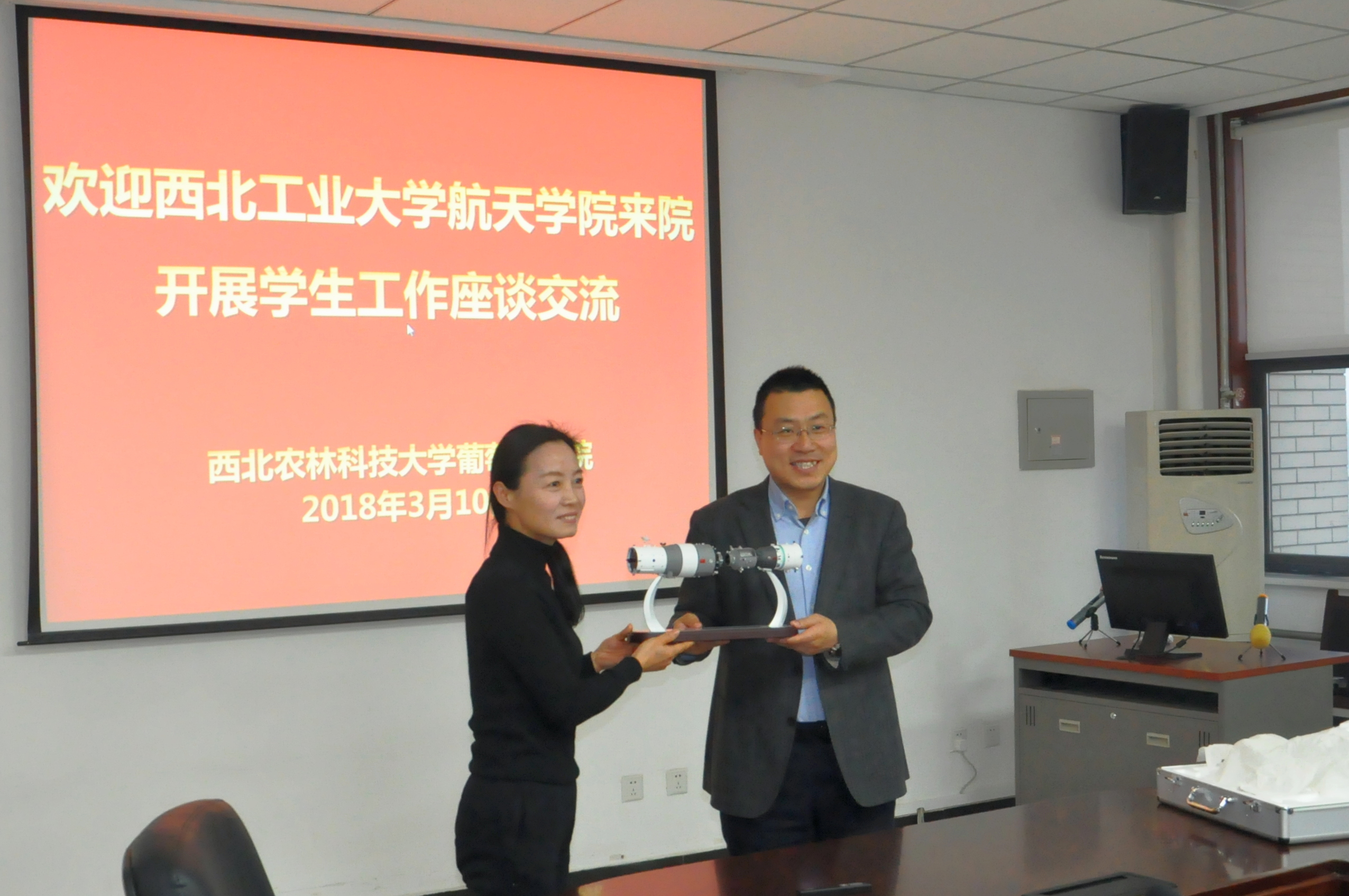 向葡萄酒学院赠送了神舟十号与天宫一号的交会对接模型,寓意两个学院从此可以亲密无间,共同前行;邓亚丽书记代表葡萄酒学院向无码av